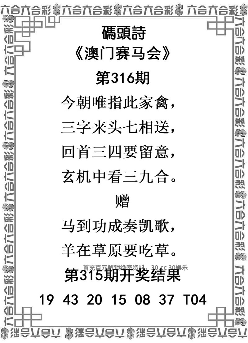 316期澳彩塞马会开马24中 解:今朝唯指此家禽,三字来头七相送,回首三四要留意,玄机中看三九合。 综合特肖:马羊鸡狗牛猪 综合主肖:马羊鸡狗 |